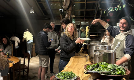 Volunteers work 6–7 hour shifts, 5 days a week, helping with different aspects of lodge life.